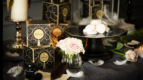 ブランド名「Huffnagel」の頭文字を「P」に変更し、さらにアナグラムによって生み出され、「Puff」と「Angel」を連結した造語です。「Puff」のおしろいはふんだんに取り入れている粉糖を意味し、「Angel」は天使、金貨(クッキーの形状)を意味しています。「Puffangel」の最大のテーマであるAngel(天使)はある名作映画に登場する天使からインスピレーションを授かり、夢と奇跡を引き起こす世界をこのお菓子の全てで演出しています。